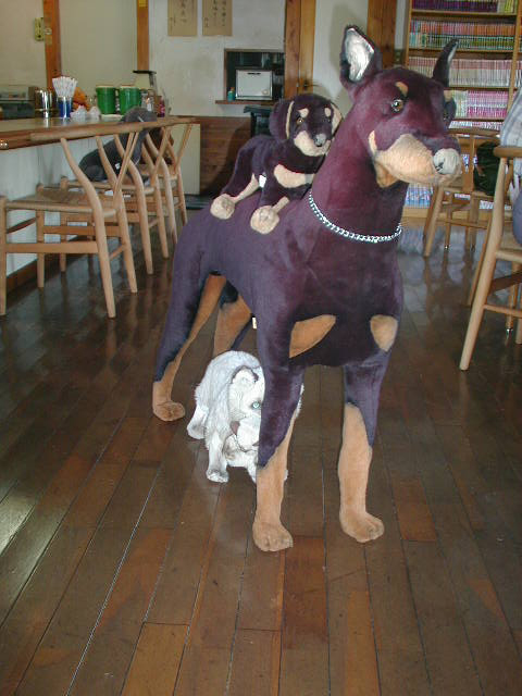 今回のごち草はbbsにリクエストのあった『杉道』に行って参りました。杉道は名前が示す通り、草薙の杉道地区にあります。この地名は、首塚稲荷にある杉の木から来ているとの事で、お店の名前もそこから取ったとの事でした。お店の場所は、南幹線から杉道の閑静な住宅街に一歩入ったところにありました。お店に一歩踏み込むと、オルゴール調の心地よい音楽と、実物大のドーベルマン親子の人形(写真)が迎えてくれました。この犬の人形は、イタリアのジャック・ラインというメーカーの人形で、一体うん十万円するものもあるとか。欲しくなった人は、店長の石川菊明さんにご相談を。予約して購入できるそうです。店内は、ログハウスう風の造りと高い天井、それと店内を一周するほどの横長の窓が印象的。またお客さんが置いていったというかわいらしい置物と、およそ1000冊以上の漫画がずっしり。