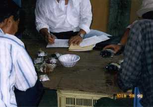 (5) 竹筒につける導火線を差し込む穴をあける。花火工場は火気厳禁、穴をあけるための機械も火花が散ると危険なので、離れた所で行われました。 |