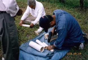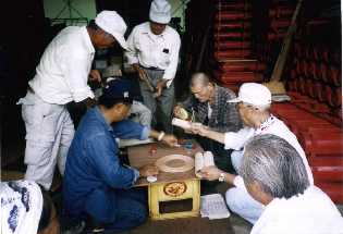 (5) 竹筒につける導火線を差し込む穴をあける。花火工場は火気厳禁、穴をあけるための機械も火花が散ると危険なので、離れた所で行われました。 |