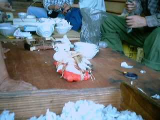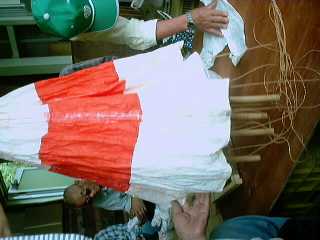 (13) パラシュートのふちにカラースモークの火薬をつける。 布のように見えるが和紙で出来ています。直径2m70cmという大きさです。 |