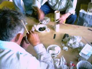 (15) 導火線のついた竹筒に細かい仕掛けの火薬や煙球を詰める。 途中で火が止まってしまわないよう、また、発火を力強いものにするために、火薬の粉をまぶした和紙を入れるなどの細やかな技! ころころした火薬もきっちり詰めないと和紙のふたが閉まらないので、皆さん何度かやり直しながら行なっていました。 |