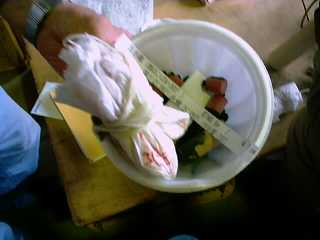 | (14) パラシュートはこのようにたたまれて本体に入れられます。きつく巻くと開かずに落ちてしまうし、そっと巻くと大きすぎて本体に入らないし・・・。 丁度良い加減が難しそうでした。 |