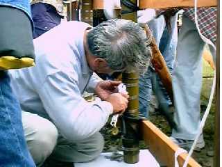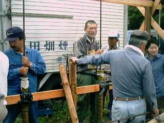 | (24) 火薬を詰め終わると、次に下(最初に新聞紙を詰めた方)から空気を通す穴を開けていきます。これは、火薬の発火速度を速め、燃焼度を強めるための穴です。 しかし、6時間近くも突き続けて詰めた火薬は、岩のように硬く詰まっているので、穴をあけるには長さ1メートル近くもある、大きなキリを使います。 下へと体重をかけながら、力いっぱいにキリの上のハンドルを回す、大変な作業です。 前日の作業はここまで。明日はとうとう打ち上げ本番!全体を完成させる日です。 |