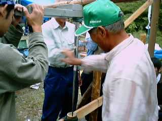 (21) 足場に竹筒をきっちり固定し、火薬詰の始まり。 竹筒の直径(これは6センチ)×9=54センチの深さまで詰めます。 水平、垂直を保っているか、火薬を詰める棒はまっすぐ振り下ろされるか、など皆さん慎重に作業を進めていきます。 |